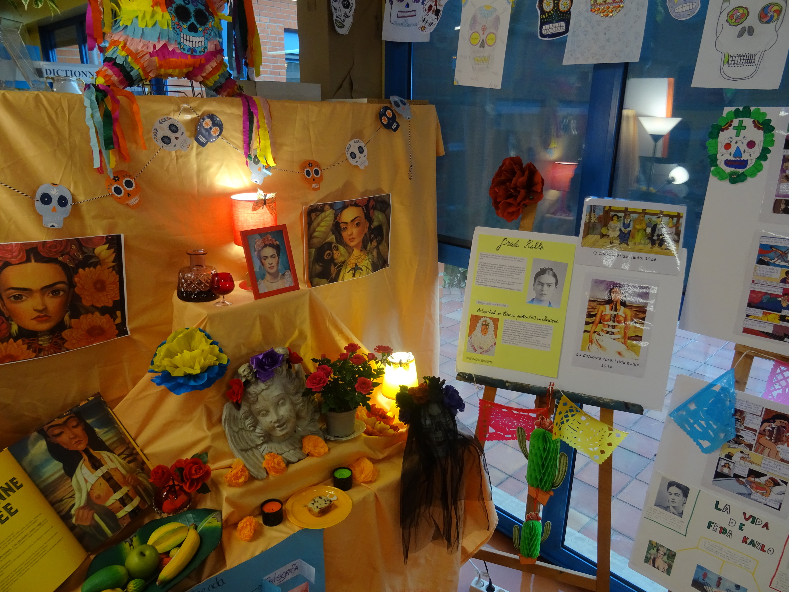 Très touché par le magnifique autel que les élèves de M. Ben Youcef et de Mme Dondon lui ont consacré, ainsi que par les nombreux panneaux retraçant sa vie tragique, l’esprit de l’artiste mexicaine Frida Kahlo, célèbre peintre du XXe siècle, s’est attardé au CDI après el dia de los muertos ce 2 novembre dernier.